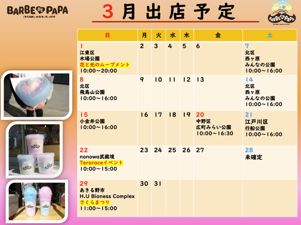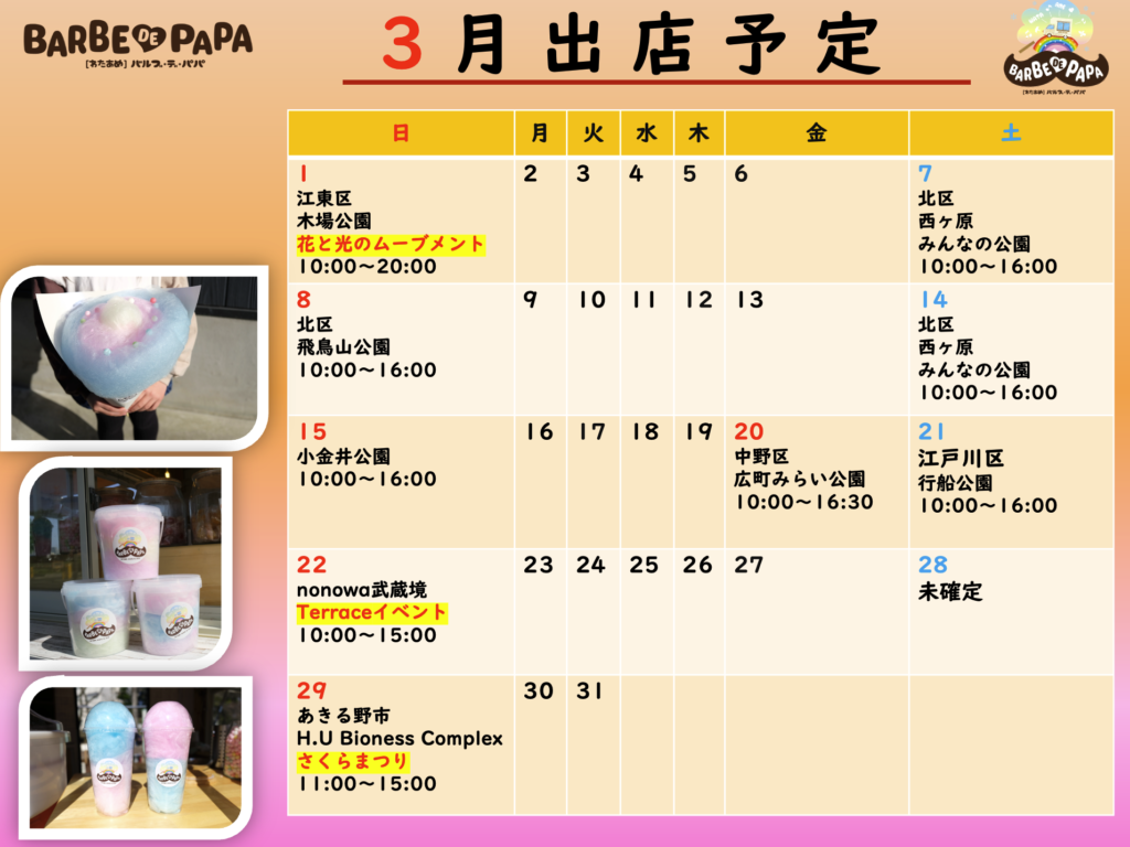 HOME > 出店予定・キャンペーン・お知らせ > 出店予定・キャンペーン・お知らせ 出店予定 【3月出店予定】 おいり増量キャンペーン!! 今月も引き続き、ご購入時にインスタグラムフォロー画面提示で 「おいり増量」キャンペーン実施中!! ぜひこの機会をお見逃しなく! お知らせ